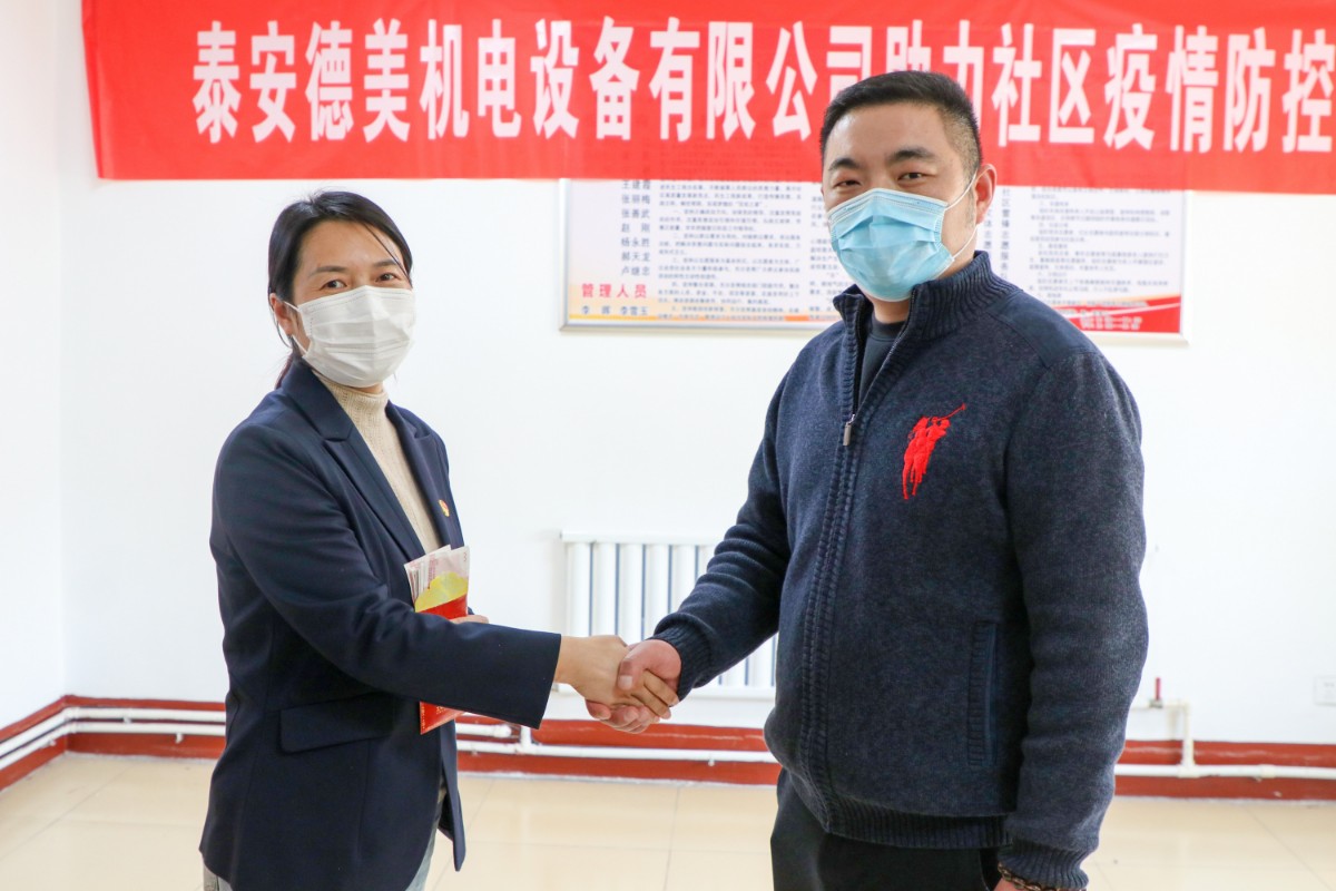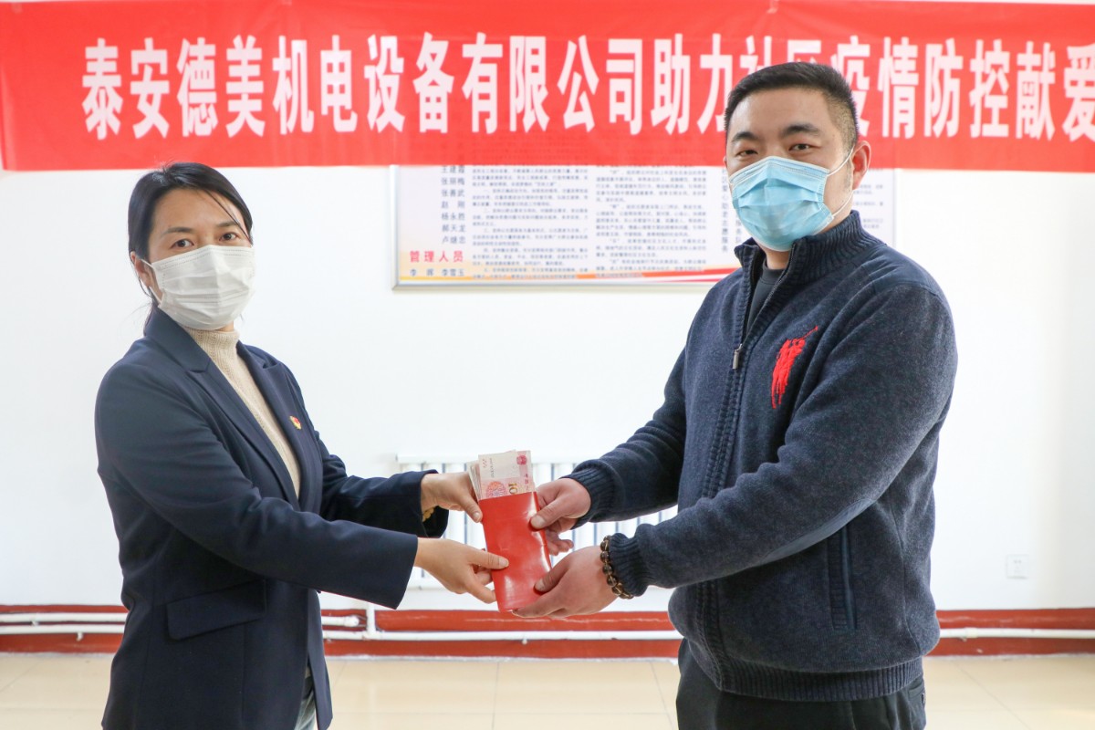 在疫情防控關(guān)鍵時(shí)期,泰安德美機(jī)電設(shè)備有限公司作為泰安國際商會(huì)副會(huì)長單位、泰山區(qū)政協(xié)委員獻(xiàn)出愛心,通過市貿(mào)促會(huì)、區(qū)貿(mào)促會(huì)牽線搭橋,為鐵路新村捐贈(zèng)防疫物資,