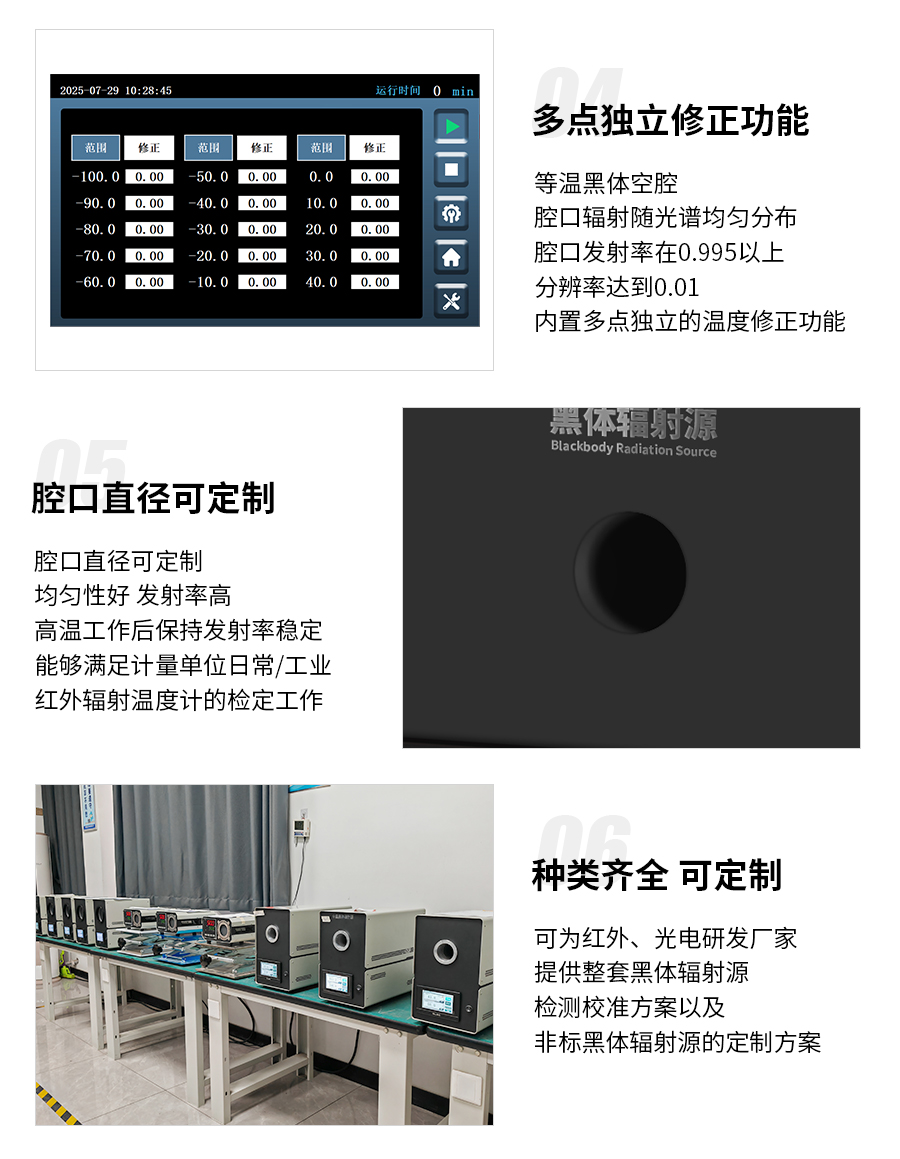 5)等溫黑體空腔,只一個腔口,腔口輻射隨光譜均勻分布,腔口發(fā)射率在0.995以上,分辨率達到0.01;