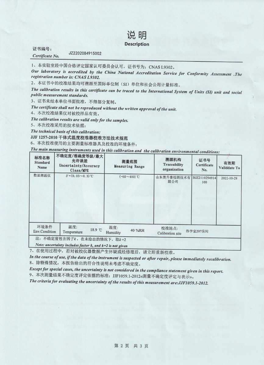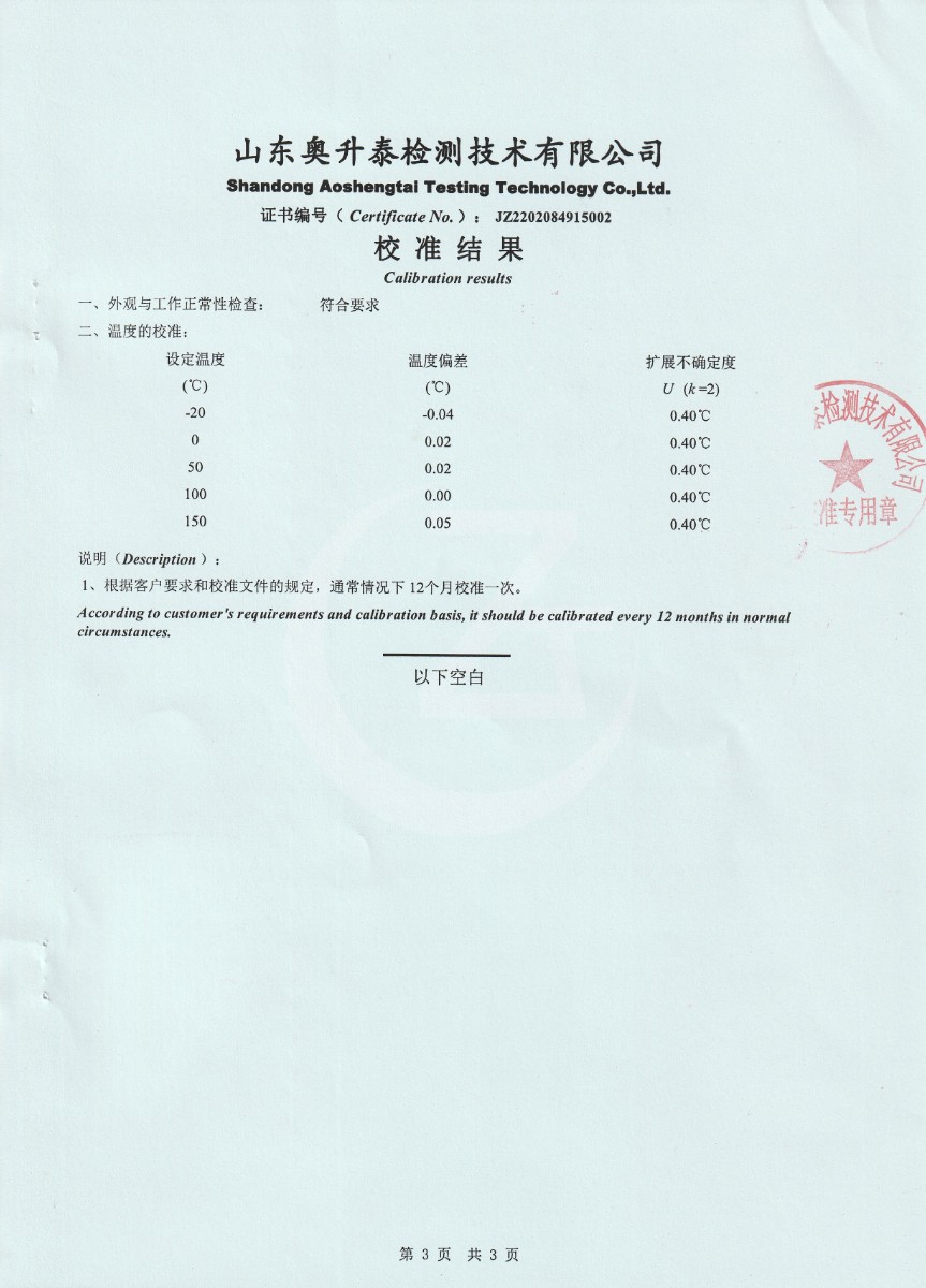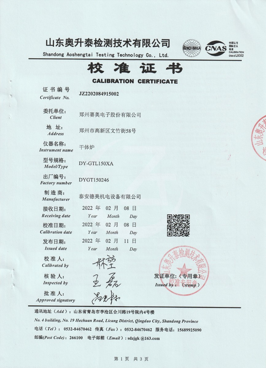 | 上一條:鄭州賽奧電子股份有限公司-干體爐DYGT150245 | 下一條:便攜式溫濕度檢定箱(-10-60℃)校準(zhǔn)證書(shū) |