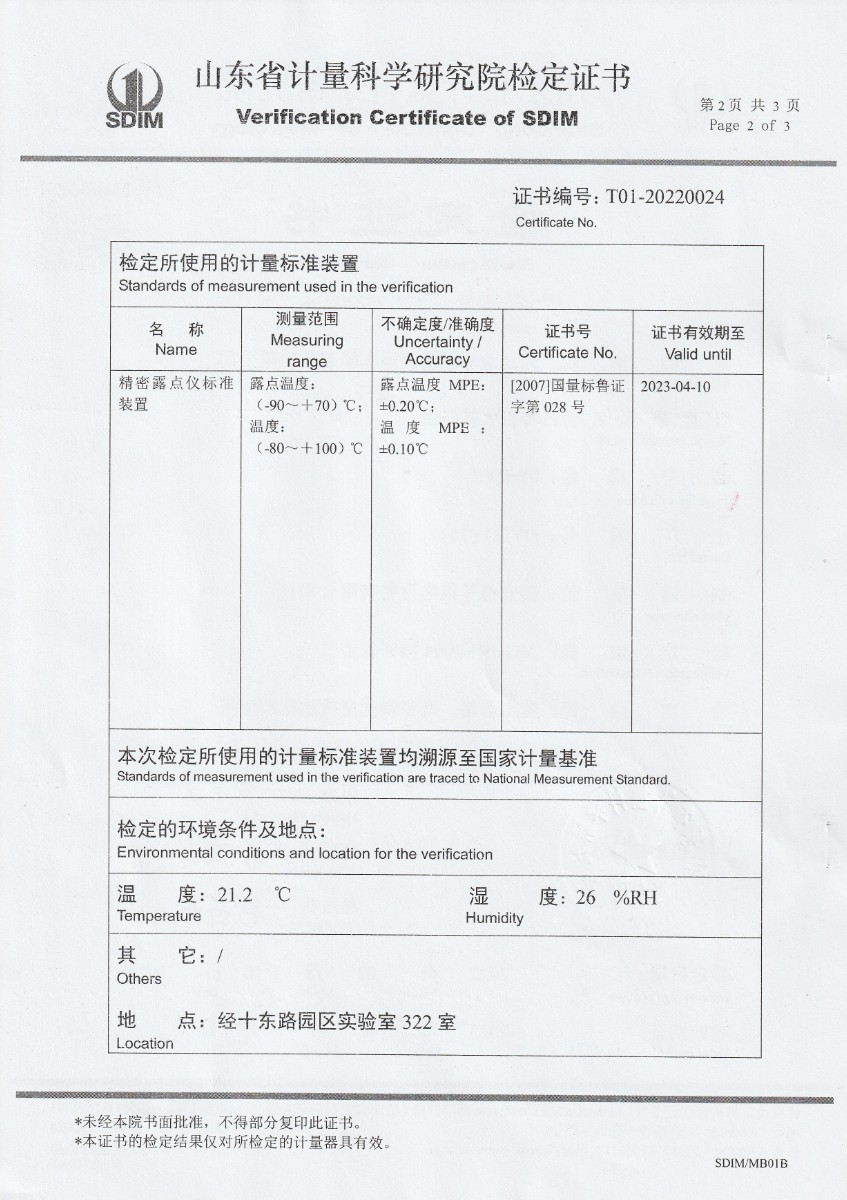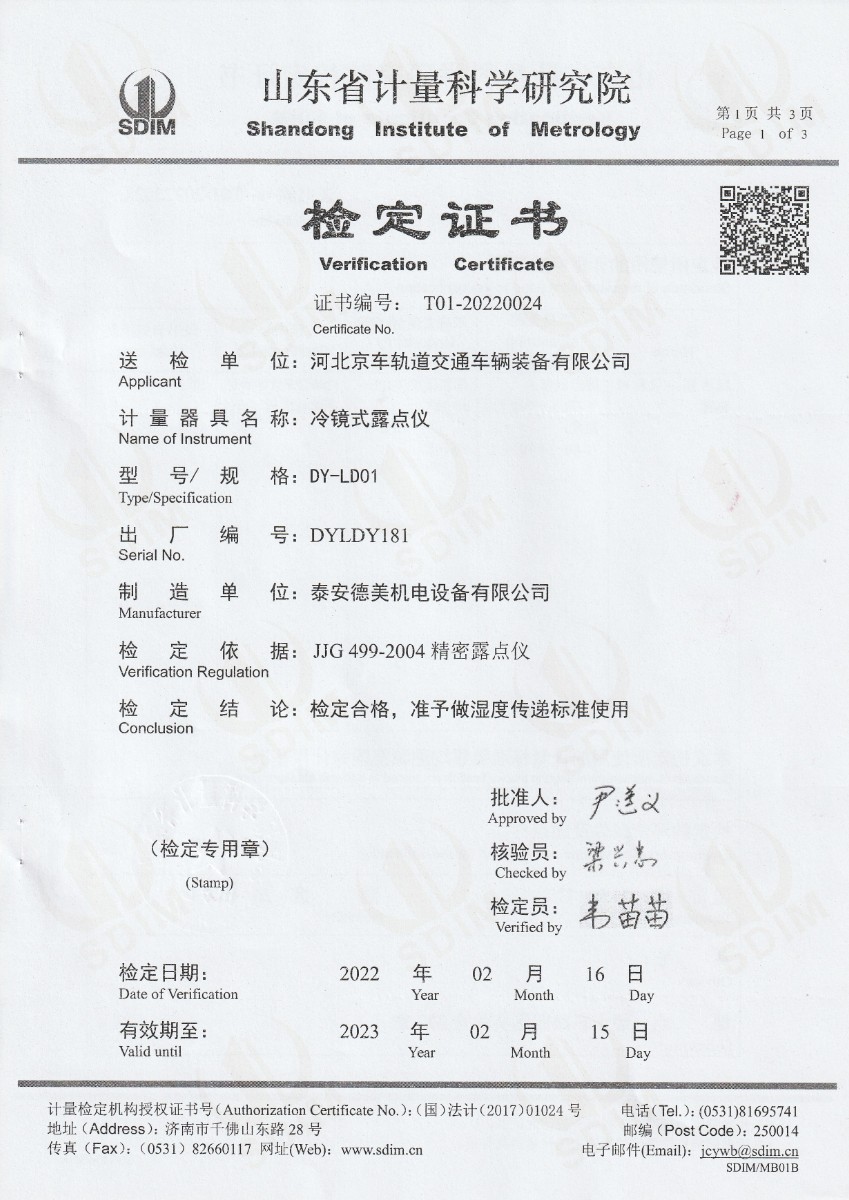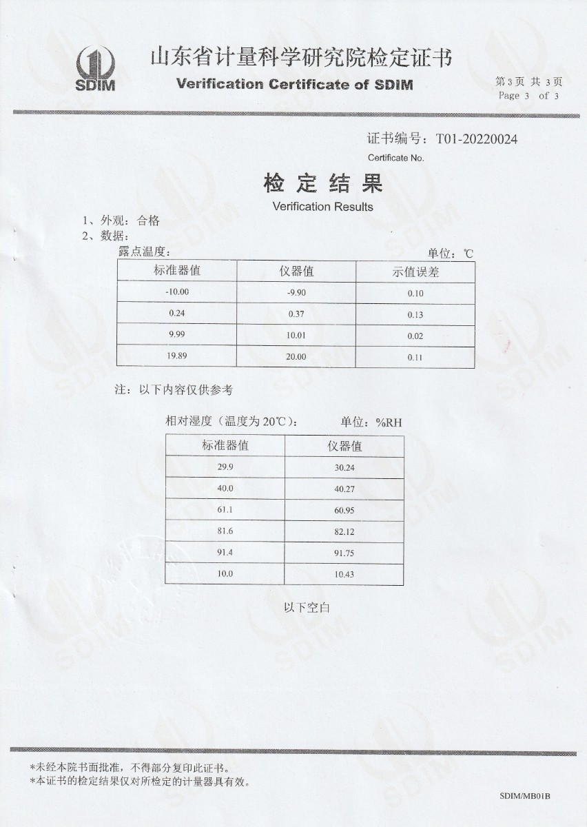 | 上一條:河北京車軌道交通車輛裝備有限公司-冷鏡式露點儀(溫度)校準證書 | 下一條:便攜式溫濕度檢定箱(-10-60℃)校準證書 |