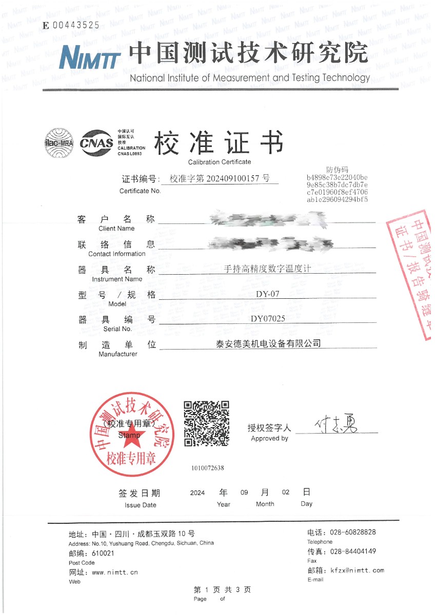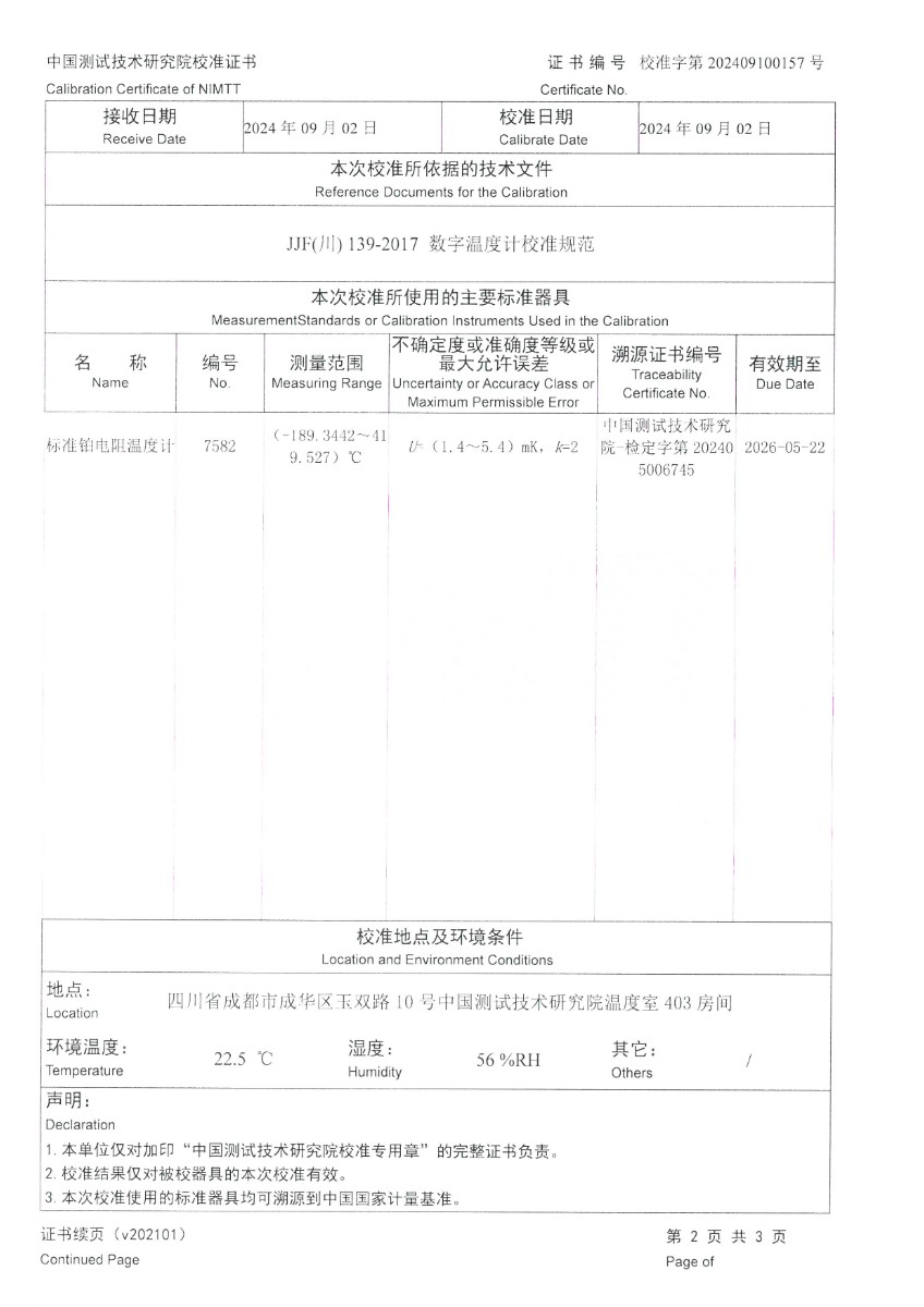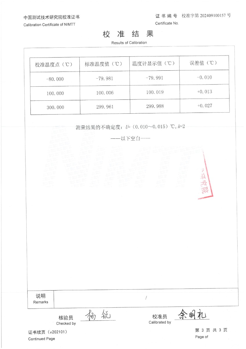 | 上一條:高精度數(shù)字溫度計(jì)(-50~200℃)校準(zhǔn)證書 | 下一條:便攜式干體爐(-30-150℃)校準(zhǔn)證書 |