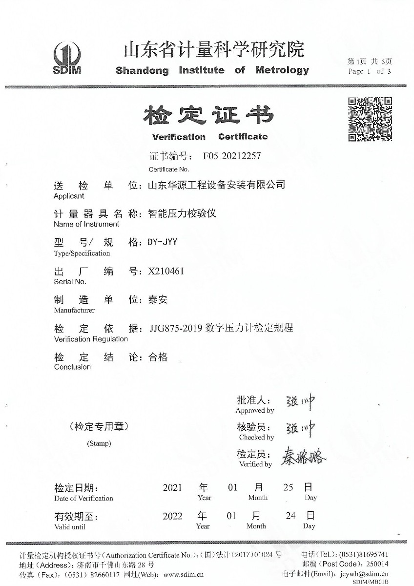 | 上一條:山東華源工程設(shè)備安裝有限公司-智能壓力校驗儀X210460 | 下一條:零點恒溫器校準(zhǔn)證書 |