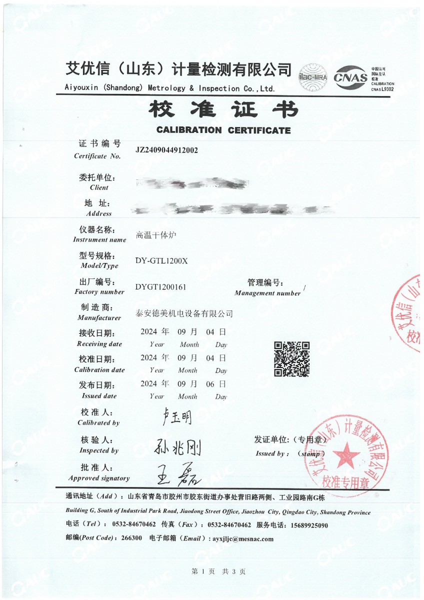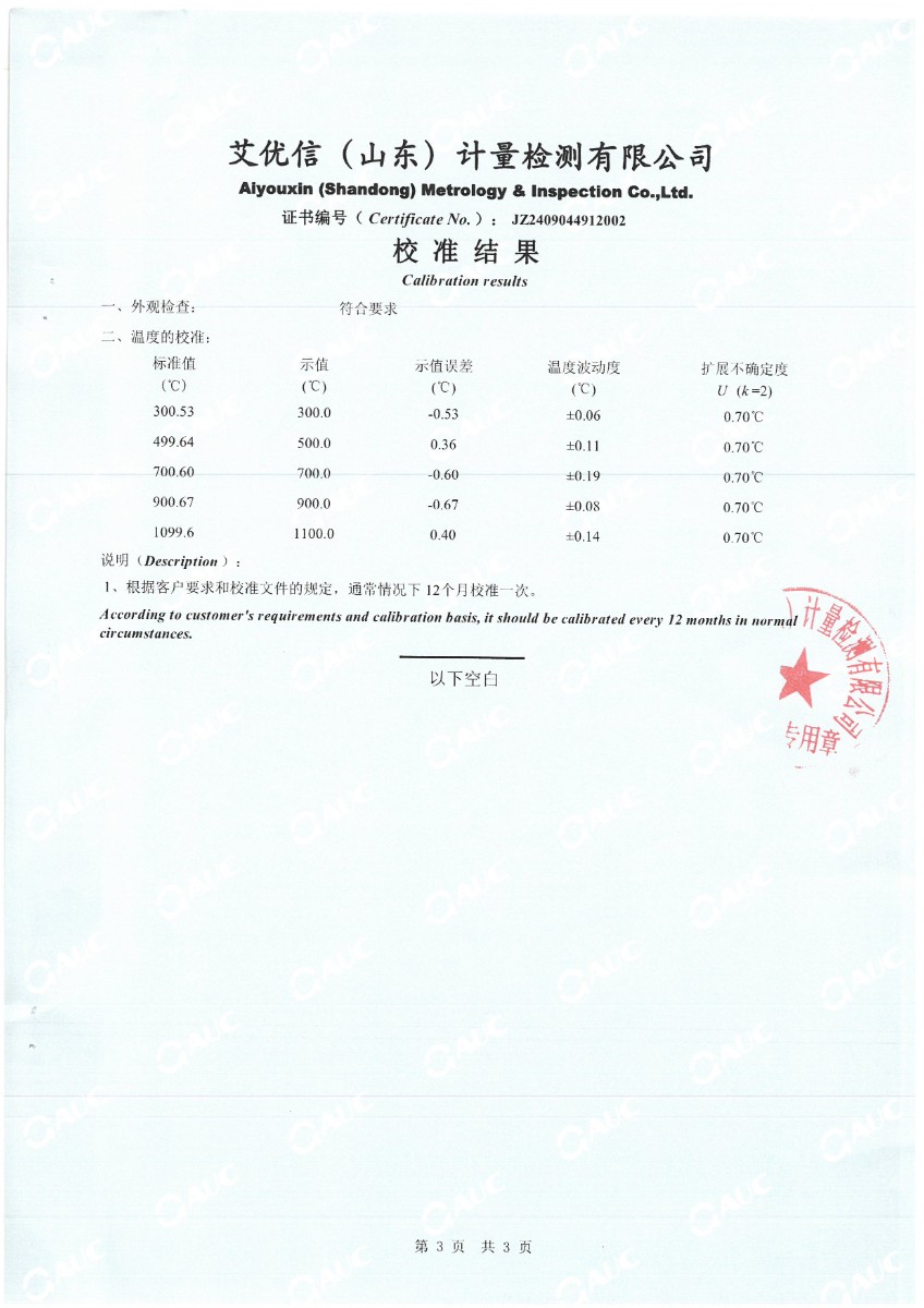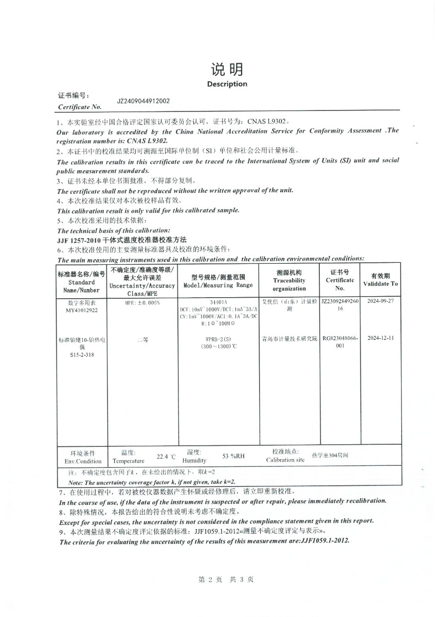高溫干體(300~1200℃)校準證書 2024-9-18 本文被閱讀 6238 次