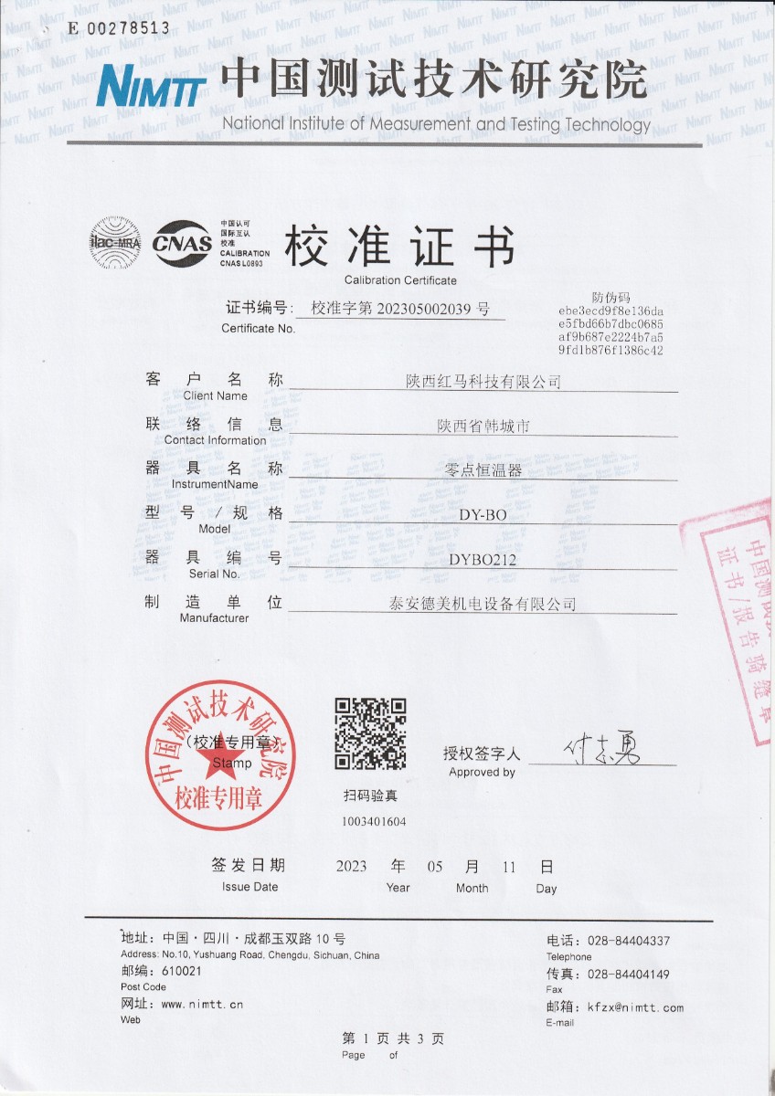 陜西紅馬科技有限公司 零點(diǎn)恒溫器 校準(zhǔn)證書 2023-5-18 本文被閱讀 10161 次